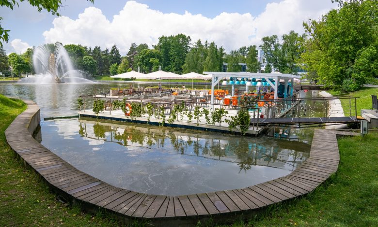 Ресторан на воде с фонтанами